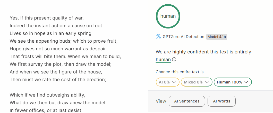 A serious detector should confidently classify this kind of text as human-written. If it doesn't — if it flags Shakespeare as 74% AI — that's not a minor technical glitch. That's a loud signal that something is fundamentally off.