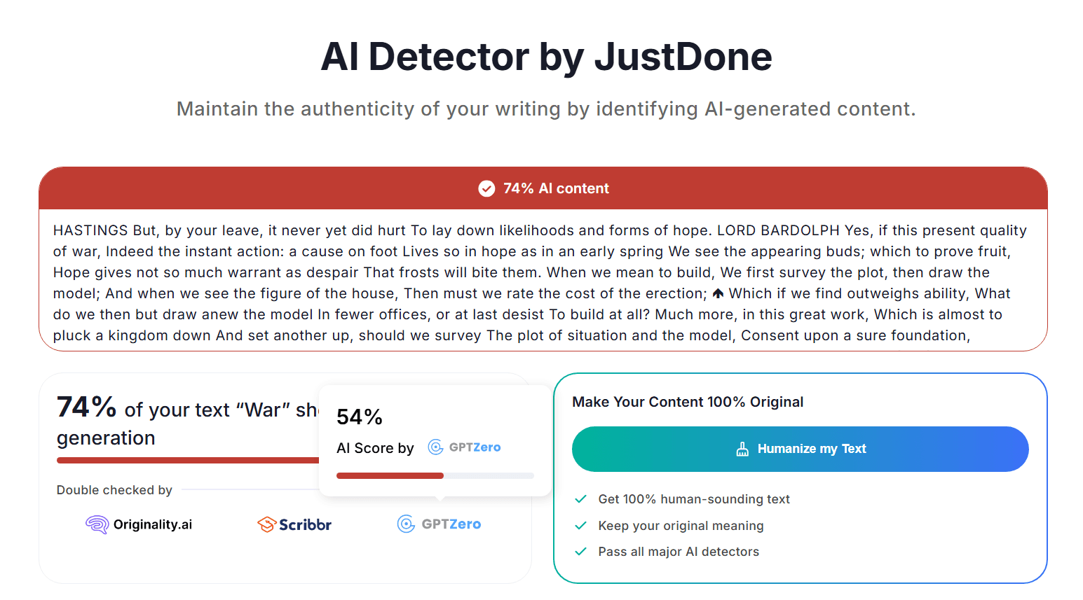 In our test, JustDone labelled Shakespeare as 74% AI and displayed "Double checked" messaging implying other tools agreed. GPTZero labelled the same text as 100% human. So it's not just that different models produce different scores — it's that JustDone used cross-check language to make a false positive seem validated, and then pushed a paid "Humanize" feature as the solution.